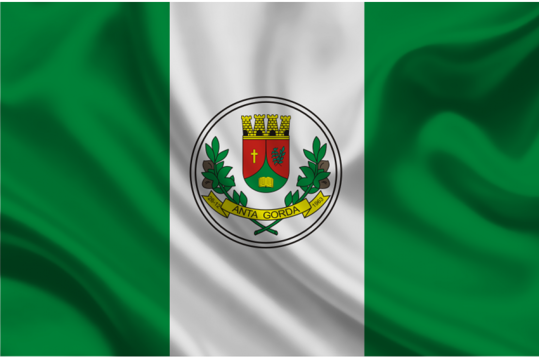 Bandeira oficial de Anta Gorda, município do estado do RS, emblema em recorte circular e aplicado tecido sobre tecidos costurados entre si.