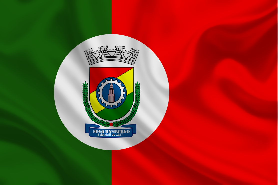 Bandeira oficial de Novo Hamburgo, município do estado do RS, confeccionada em poliéster ou nylon paraquedas, em diversos tamanhos, com brasão dupla face, tralha reforçada e costuras duplas .