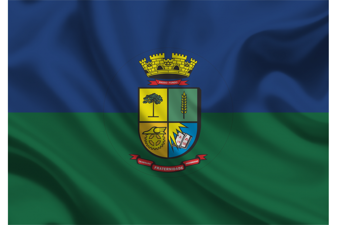 Bandeira oficial de Passo Fundo, município do estado do RS, confeccionada em poliéster, em diversos tamanhos, brasão estampado em recorte retangular e aplicado tecido sobre tecidos costurados entre si.