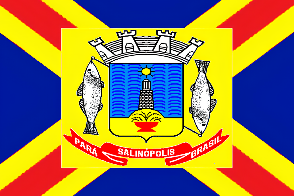 Bandeira oficial de Salinópolis, município do estado de PA, confeccionada em poliéster, em diversos tamanhos, emblema em recorte retangular.