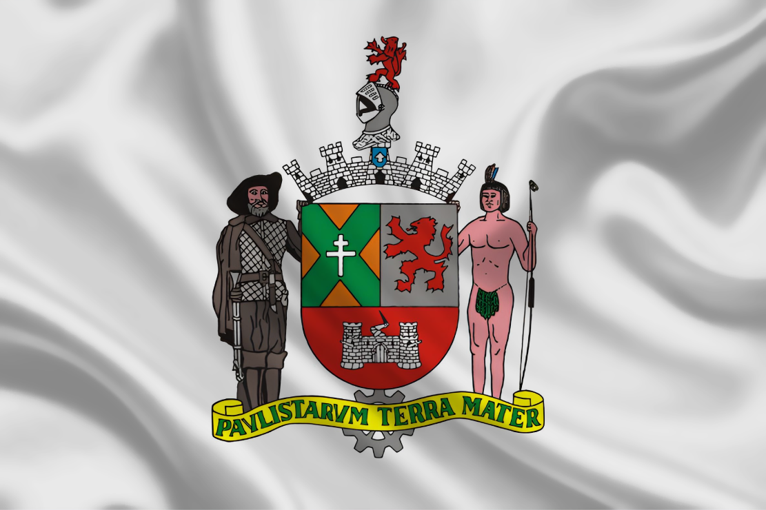 Bandeira oficial de São Bernardo do Campo, município do estado de SP, confeccionada em poliéster, em diversos tamanhos, emblema recorte circular.