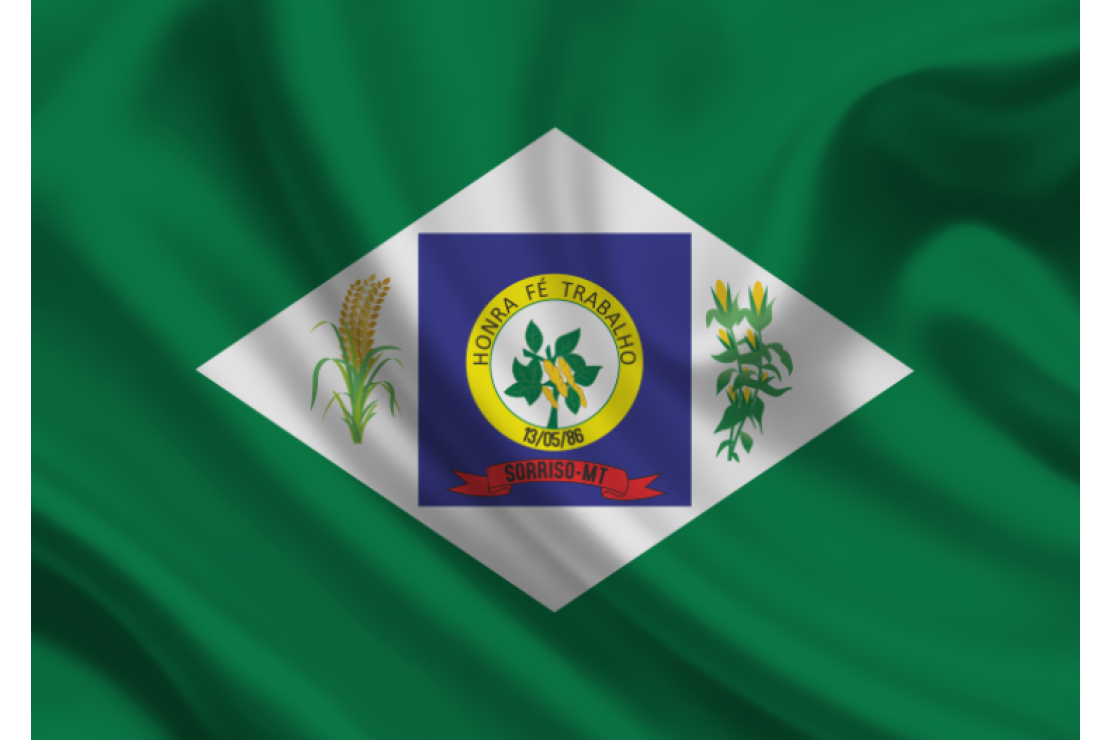 Bandeira oficial de Sorriso, município do estado de MT, confeccionada em poliéster, em diversos tamanhos, emblema em recorte losangular.