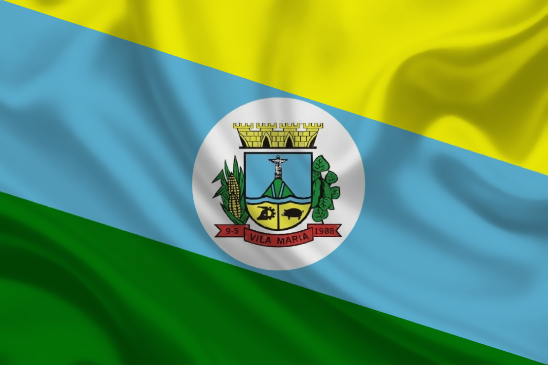 Bandeira oficial de Vila Maria, município do estado de RS, confeccionada em poliéster, em diversos tamanhos, emblema estampado em recorte circular em tecidos costurados entre si.