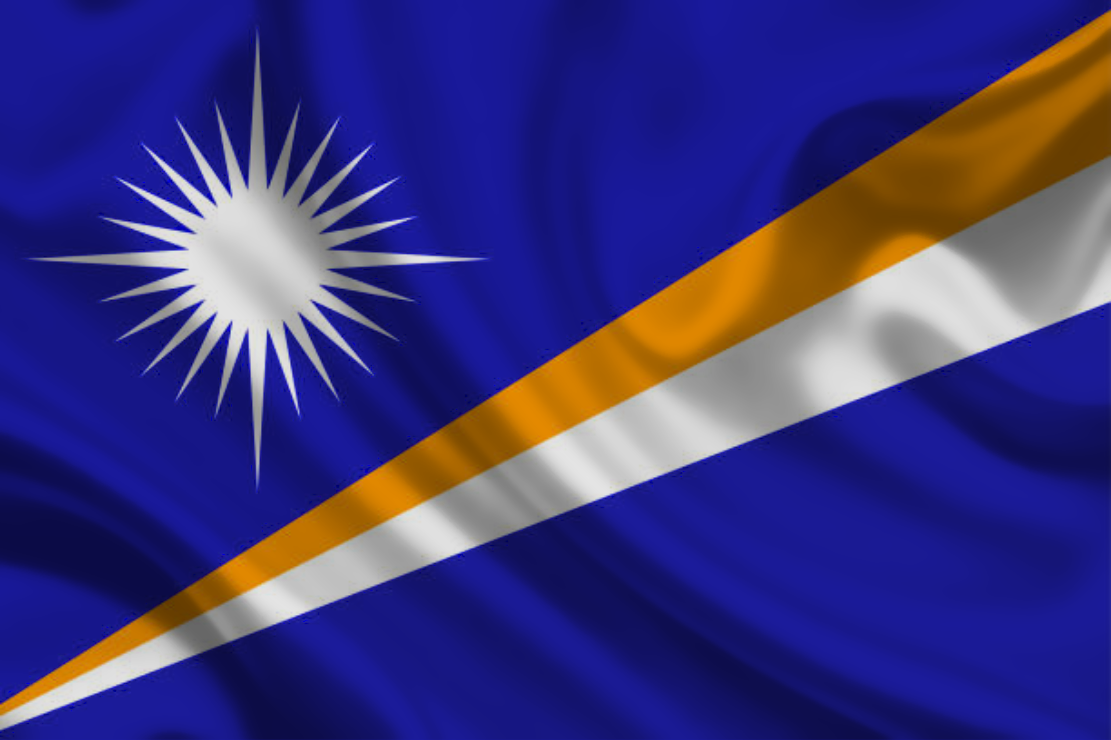 Bandeira oficial de Ilhas Marshall, confeccionada em poliéster oxford, totalmente estampada e em tecido duplo, tralha com alças em cordão e costuras duplas,