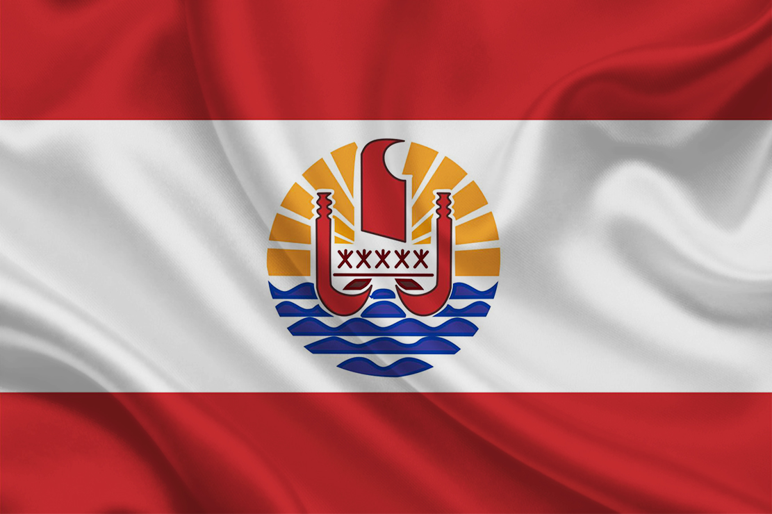 Bandeira oficial do Taiti, confeccionada em poliéster, emblema estampado em recorte circular e aplicado tecido sobre tecidos costurados entre si em ambas as faces.
