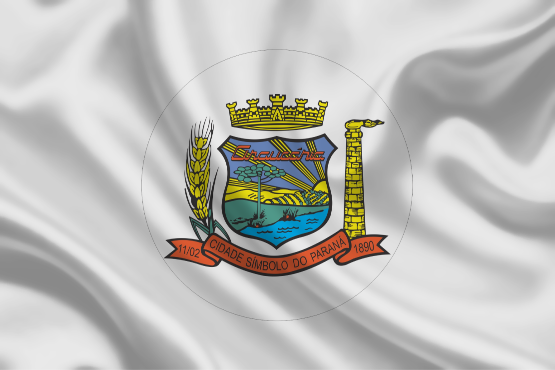 Bandeira oficial de Araucária, município do estado do PR, confeccionada em poliéster, em diversos tamanhos, com brasão dupla face, emblema estampado em recorte circular e aplicado tecido sobre tecido liso .