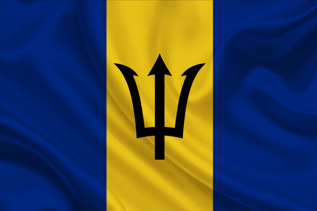 Bandeira oficial do  Barbados, confeccionada em poliéster oxford, com emblema estampado e aplicado tecido sobre tecidos costurados entre si, dupla face, tralha com alças em cordão e costuras duplas, na medida 90x129cm.   Para outras medidas entre em contato  via WhatsApp 51 984062653.