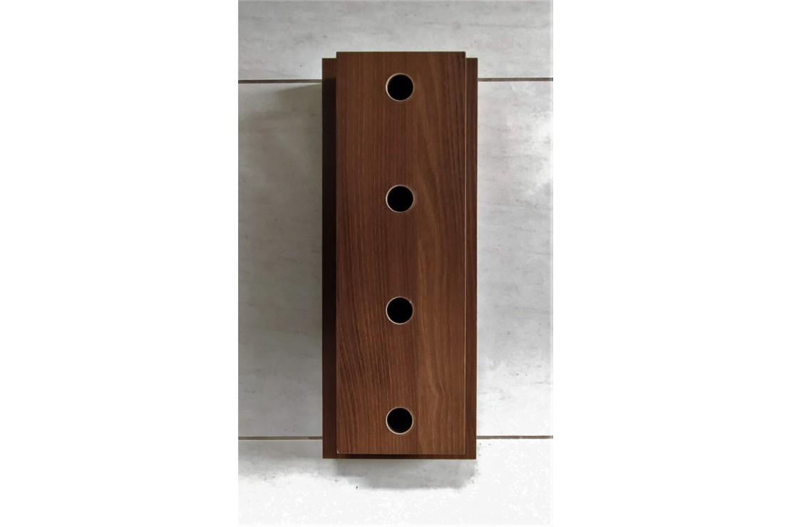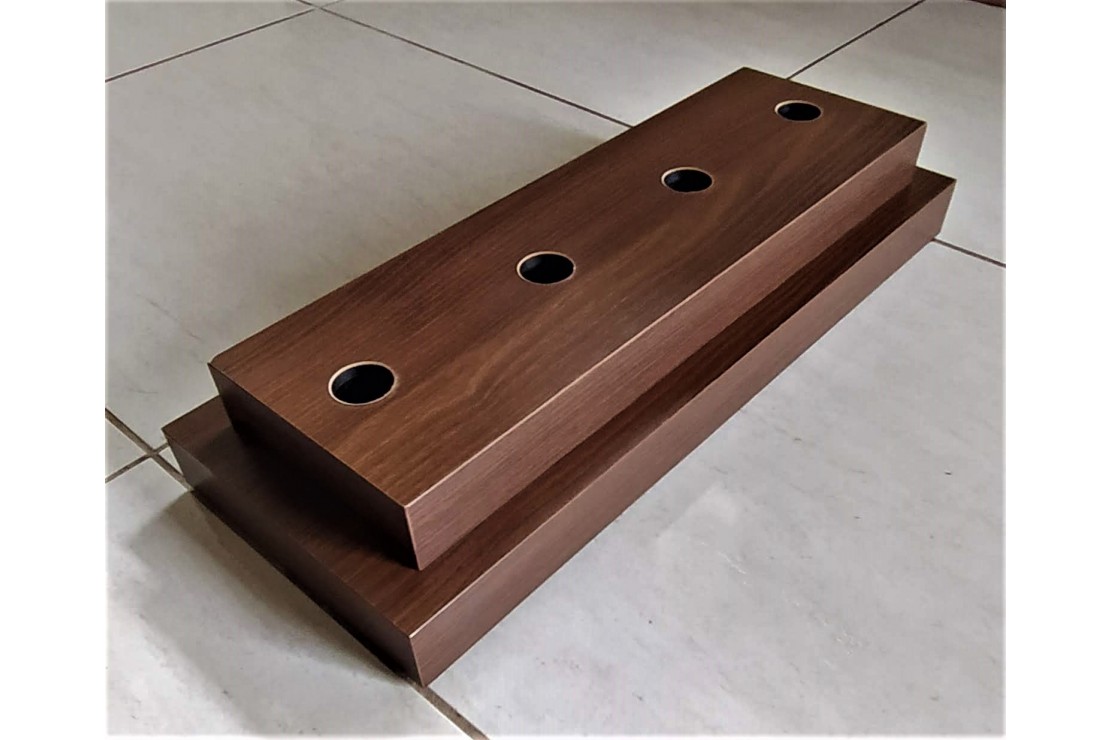 Base retangular em madeira com revestimento laminado na cor imbuia, suporte para quatro mastros, medindo 10x21x52cm.