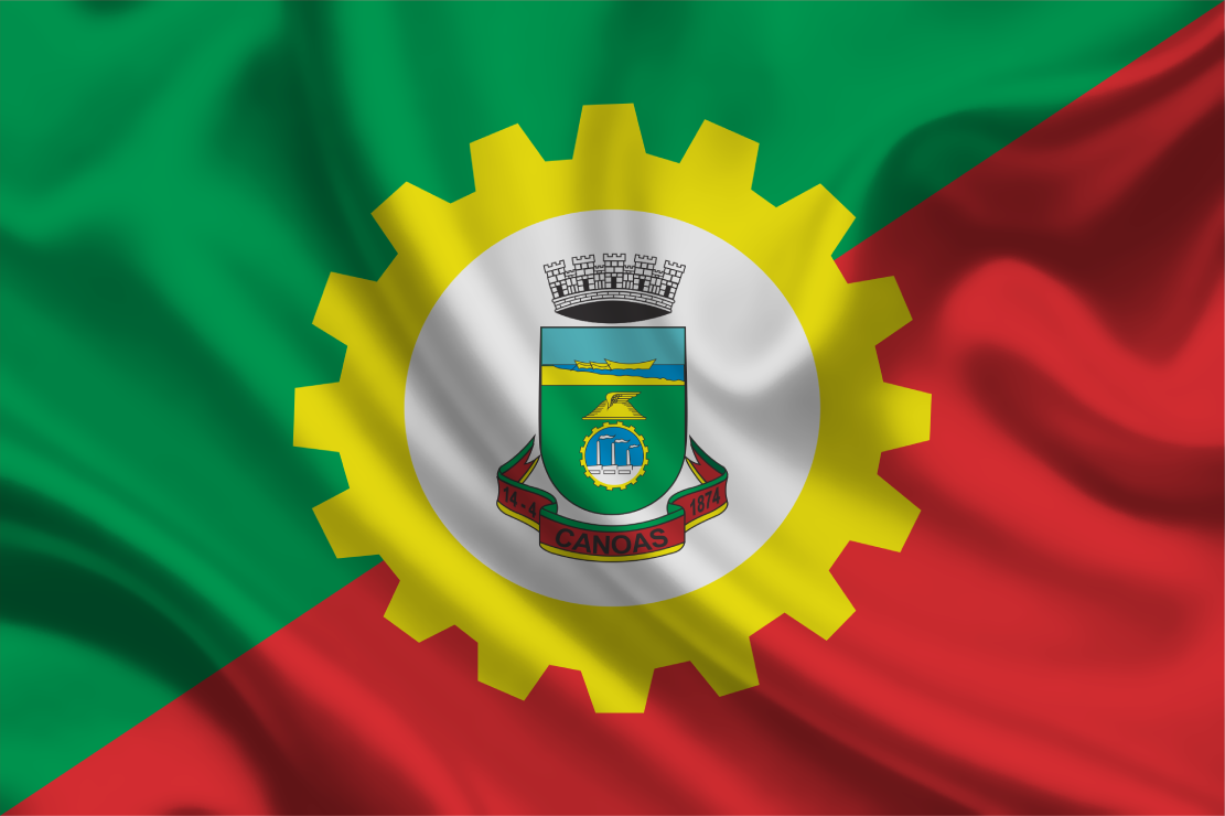 Bandeira oficial de Canoas, município do estado do RS, confeccionada em poliéster, em diversos tamanhos, com brasão dupla face, emblema estampado em recorte circular e aplicado tecido sobre tecidos costurados entre si.
