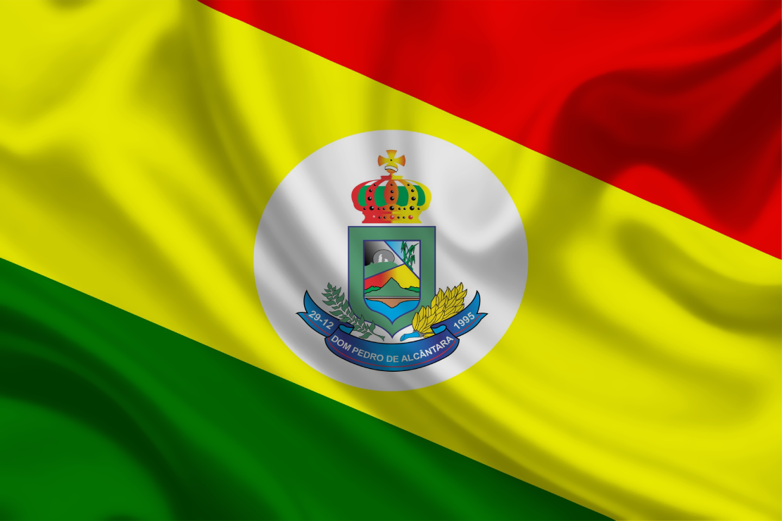Bandeira oficial de Dom Pedro de Alcântara, município do estado do RS, confeccionada em poliéster, em diversos tamanhos, com brasão dupla face,emblema estampado em recorte circular e aplicado tecido sobre tecidos costurados entre si.