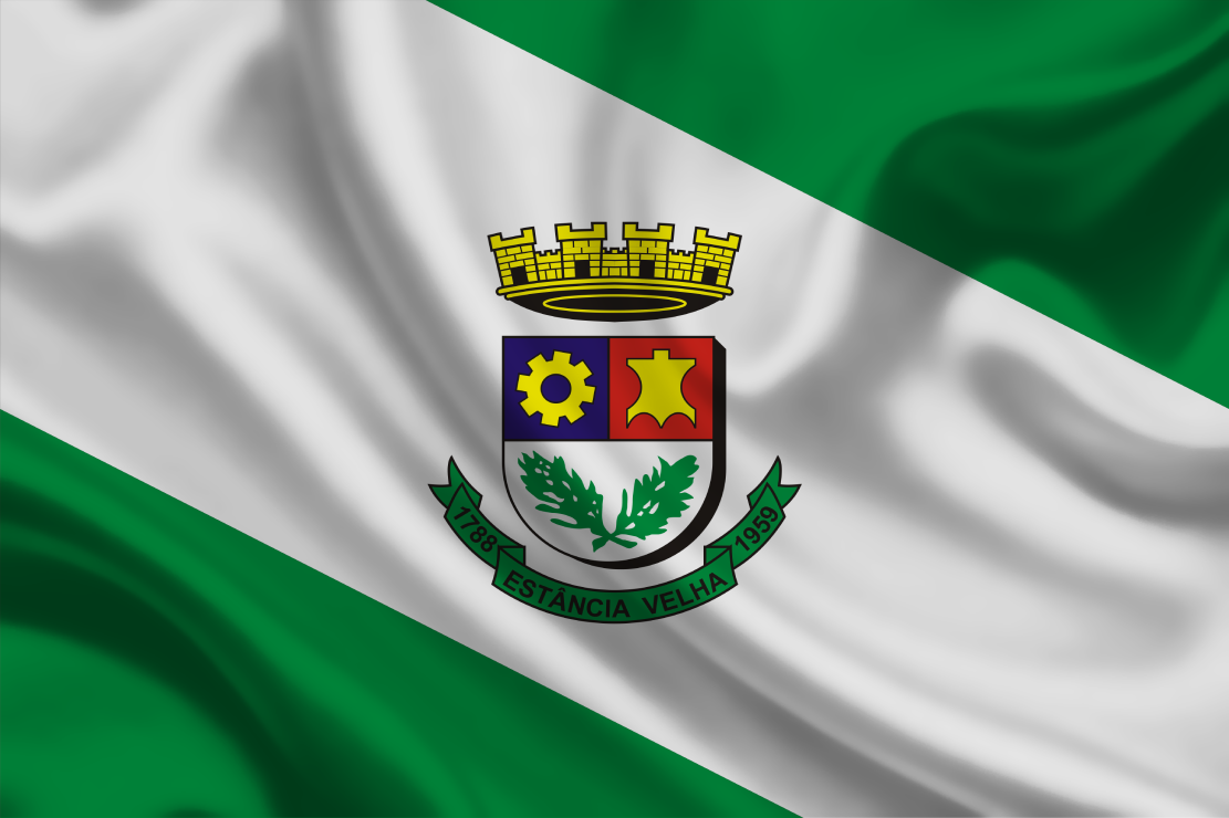 Bandeira oficial de Estância Velha, município do estado do RS, confeccionada em poliéster, em diversos tamanhos, com brasão dupla face, emblema estampado em recorte circular e aplicado tecido sobre tecidos costurados entre si.