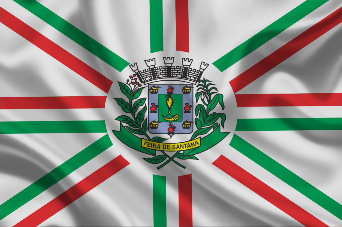 Bandeira oficial de Feira de Santana, município do estado do BA, confeccionada em poliéster, em diversos tamanhos, com brasão dupla face, emblema estampado em recorte circular e aplicado tecido sobre tecidos costurados entre si.
