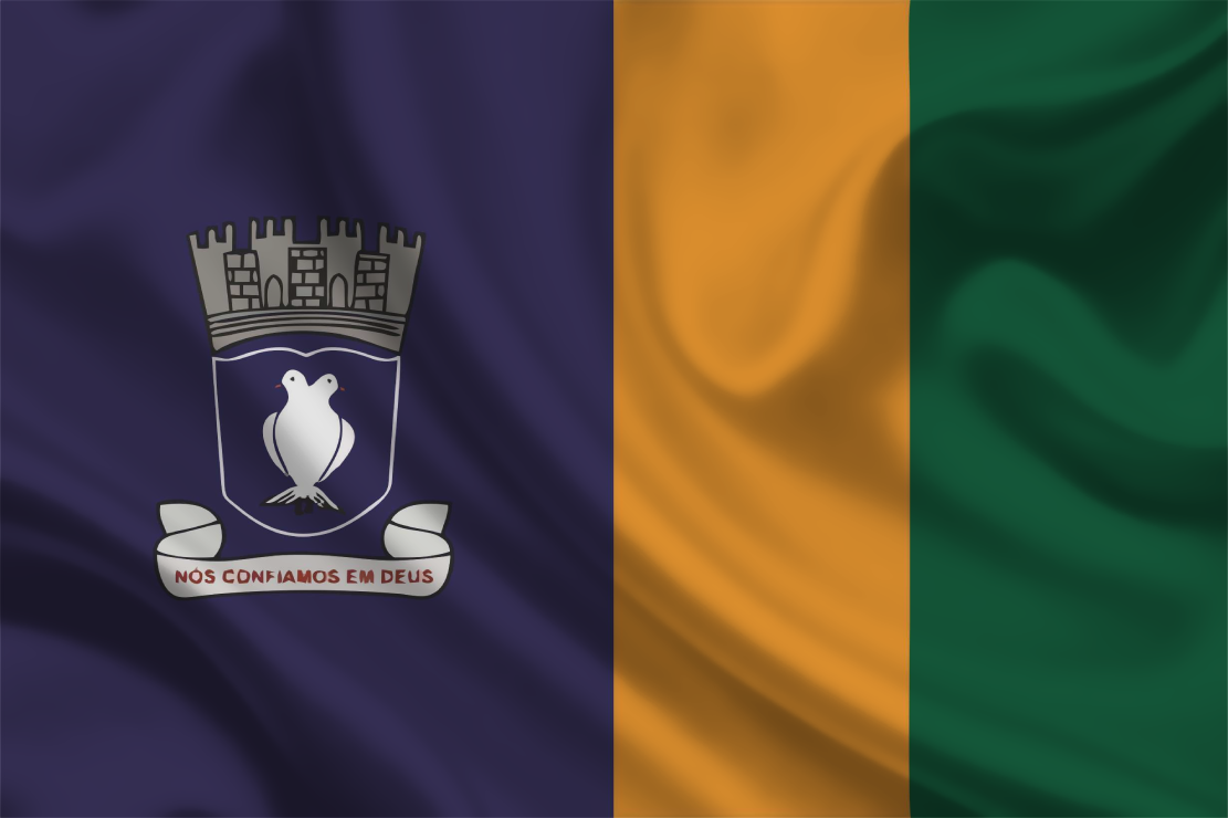 Bandeira oficial de Lauro de Freitas, município do estado do BA, confeccionada em poliéster, em diversos tamanhos, emblema estampado em recorte circular e aplicado tecido sobre tecidos costurados entre si.