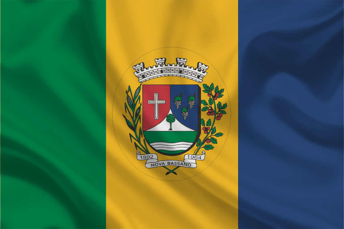 Bandeira oficial de Nova Bassano, município do estado do RS, confeccionada em poliéster, em diversos tamanhos, emblema estampado em recorte circular e aplicado tecido sobre tecidos costurados entre si.