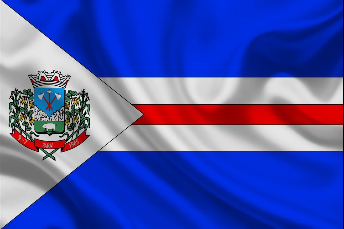 Bandeira oficial de Paraí, município do estado do RS, confeccionada em poliéster, em diversos tamanhos, emblema estampado em recorte circular e aplicado tecido sobre tecidos costurados entre si.