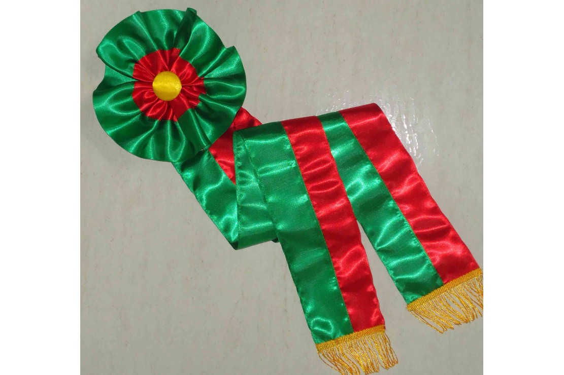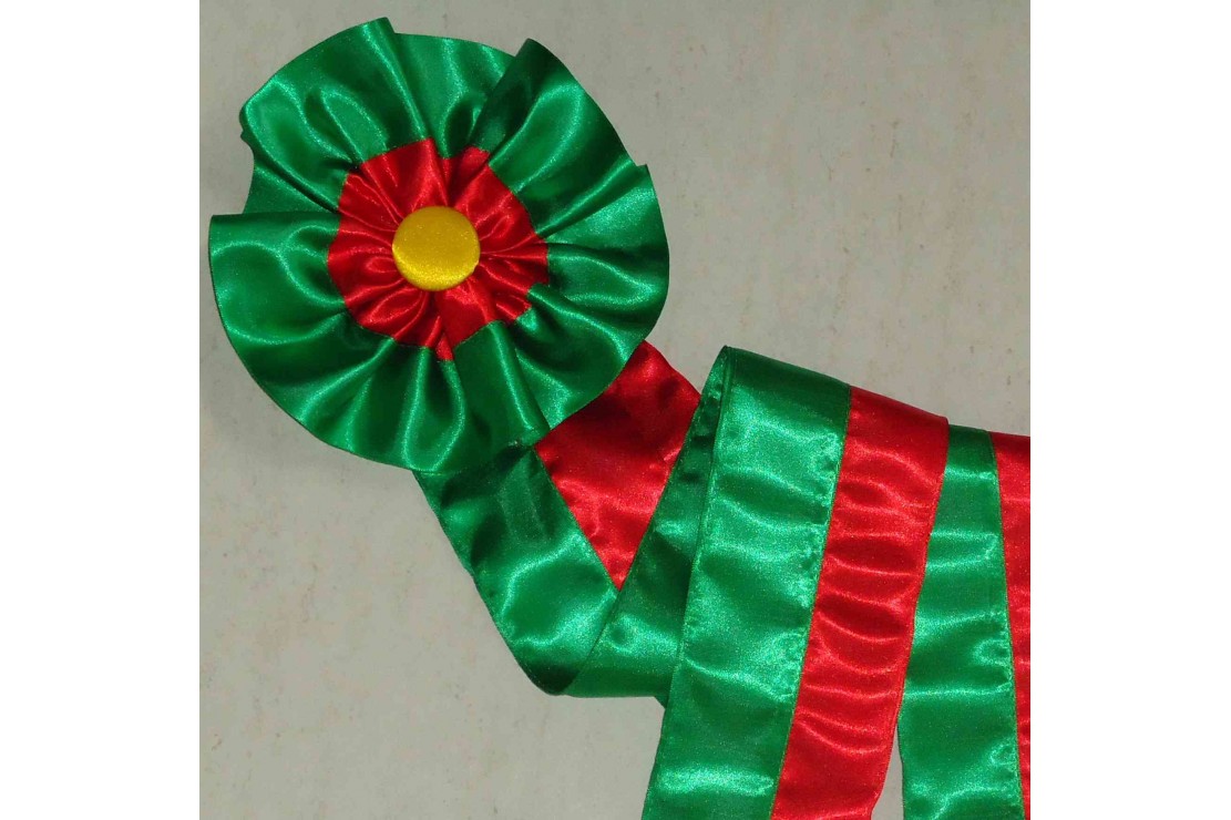 Roseta em cetim para mastros internos, faixa de 7,5x70cm, flor 14cm.